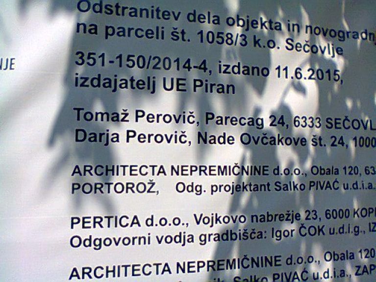 A ni šlo za pogovor s kakšnim na novo nastavljenim hrvaškim varnostnikom, ki bi bil tam na nepričakovani misiji. Izmenjava ognjenih besed je sledila mojemu začudenju, ko sem v zaspani vasici opazil veliko gradbišče, na katerem so delavci ravnokar polagali betonsko ploščo nečesa, kar bo v nadaljevanju najverjetneje postalo dvorec ali kaj podobnega. Skozi zavest mi je šinil davni spomin, star skoraj tri desetletja in pol: tako so v Opatiji gradili vilo admiralu Mamuli! Tam se je začela Jugoslavija krhati. Čudovit razgled me je še kar naprej pritegoval, dokler nisem kljub svarilom pristopil globlje h gradbišču in si ogledal veliko tablo, ki je razodevala investitorja in namen gradnje. V trenutku je bilo, kot bi vame zasikala kača. Odstopil sem in globoko vdihnil. Tam je gradil človek, ki sem mu v zadnjem Reporterju vnovič zastavil vprašanje, ali je v Novi Ljubljanski banki pred dobrimi desetimi leti dobil kredit za nakup plovila, velikega približno dvajsetih metrov. Kot že nekajkrat poprej tudi tokrat ni bilo odgovora. Na tabli pred gradbiščem, čisto ob cesti, se je namreč bohotil napis, ki je razodeval, kdo je pridobil pravico do gradnje: »Gradbeno dovoljenje št. 351-150/2014-4, izdala Tomažu in Darji Perovič (ulica Nade Ovčakove 24, 1000 Ljubljana) 11. 6. 2015, Upravna enota Piran«.