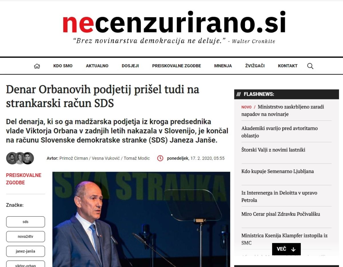 Objave na spletnem portalu necenzurirano.si o financiranju stranke SDS iz krogov okoli madžarskega premierja Viktorja Orbana v največji slovenski stranki ali njenih trobilih (Nova24tv, Demokracija) niso vsebinsko zavrnili, kar veliko pove. V svojem stilu so se lotili obračunavanja z novinarji- avtorji teh razkritij. Vsekakor mora zadevo podrobno preučiti tudi Računsko sodišče, saj bi šlo za nezakonito ravnanje.
