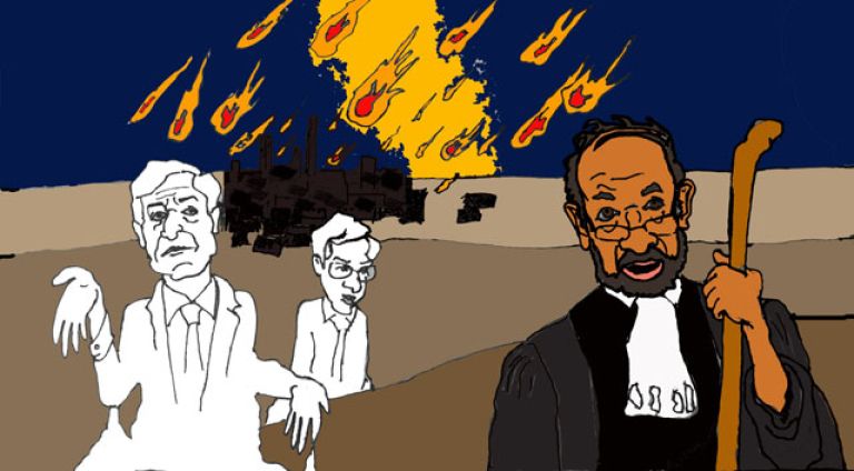 Zvečer so malo pregloboko pogledali v kozarce in zjutraj se Abraham ni prav dobro spomnil, ali je tistim zmešanim Slovencem res obljubil, da jih bo zastopal v arbitražnem postopku. Abrahamu zahtevna posredovanja niso tuja, kajti 'omen est nomen'. Kar spomnimo se, kako vneto je njegov biblijski soimenjak iskal rešitev, da zblojeni prebivalci Sodome ne bi bili pokončani z ognjem in žveplom. Skliceval se je na to, da je morda med prebivalci grešnega mesta petdeset, petinštirideset, trideset … no, ali vsaj deset pravičnih.