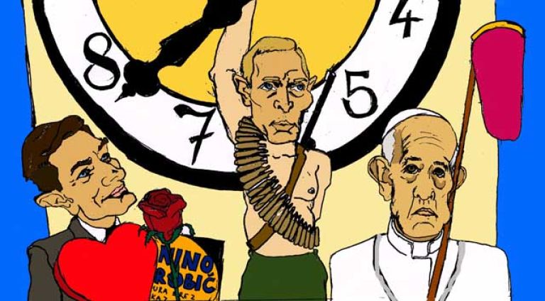Prejšnji teden je izšla okrožnica papeža Frančiška, v kateri ta poziva vse katoličane naj bodo naslednjo nedeljo pri nabirki še posebej radodarni. Z zbranimi sredstvi bo sveti sedež namreč ruskemu predsedniku Vladimirju Putinu kupil uro. Papež upa, da bo darilo prvemu možu Rusije, ki ga je obsedel demon zamujanja, pomagalo k spreobrnjenju. Putin je namreč prejšnjo sredo prispel v Vatikan na avdienco pri svetem očetu z več kot enourno zamudo. Menda zato, ker enkrat ni nobenkrat in se mu je zdelo zabavno ponoviti podvig izpred dveh let, ko je papeža pustil čakati le kratkih petdeset minut. Obogaten s to dvojno izkušnjo se papež Frančišek zdaj poigrava z idejo, da bi imela ura namenjena predsedniku Putinu vgravirano misel kardinala Newmana: »Čas je kratek, večnost je dolga.«