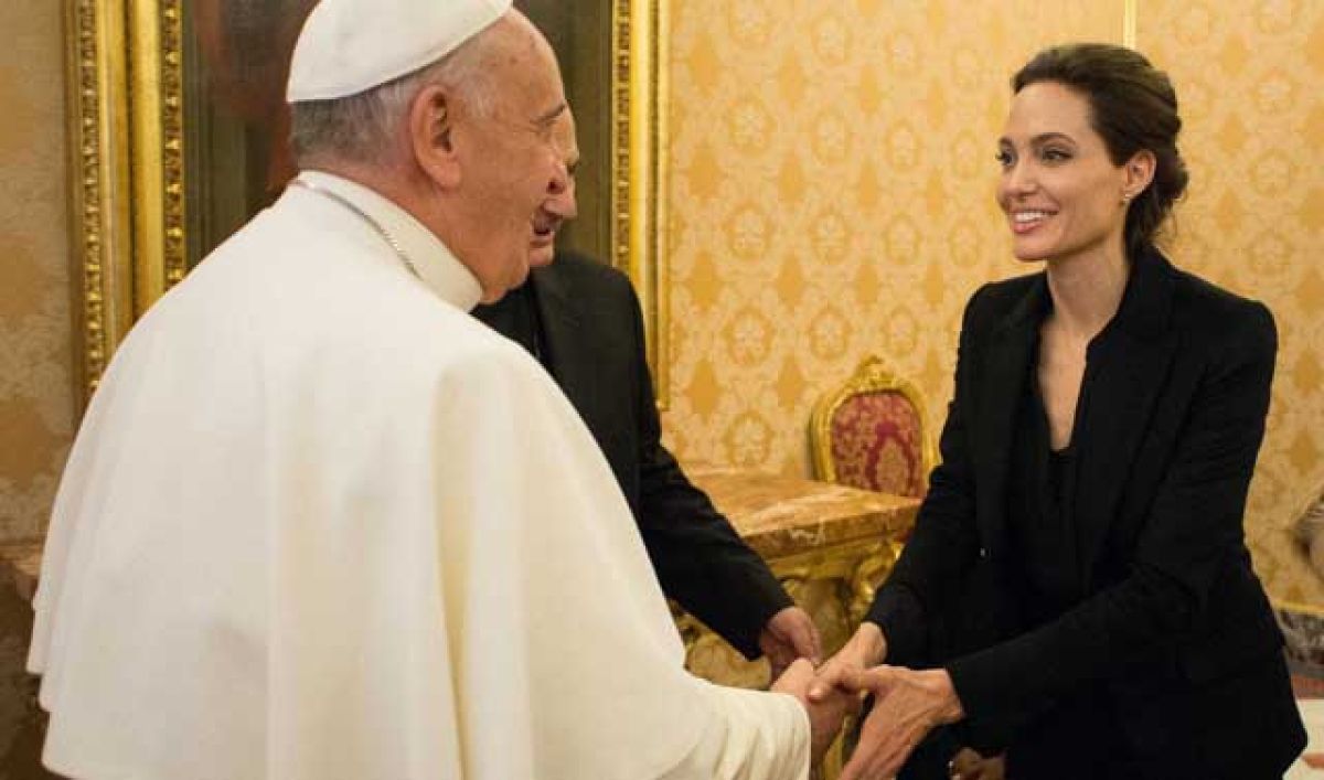 Ameriška filmska zvezdnica Angelina Jolie je danes v Vatikanu predstavila svoj film Unbroken (Nezlomljiv) in se na kratko sešla s papežem Frančiškom. Srečala sta se v apostolski palači, Joliejeva je papežu poljubila prstan, on pa ji je kot vsem obiskovalcem podaril rožni venec, je sporočil tiskovni predstavnik Svetega sedeža Federico Lombardi.