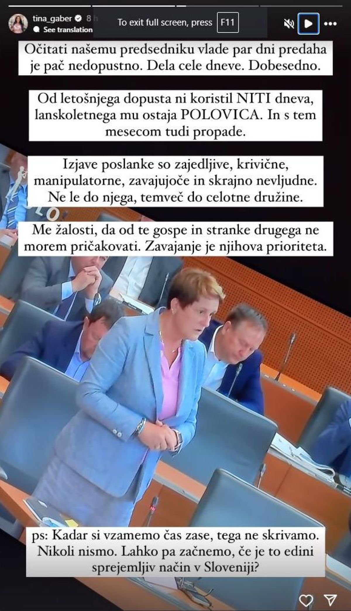 »Očitati našemu predsedniku vlade par dni predaha je pač nedopustno. Dela cele dneve. Dobesedno,« se je na Instagramu razhudila Tina Gaber, partnerka predsednika vlade Roberta Goloba.