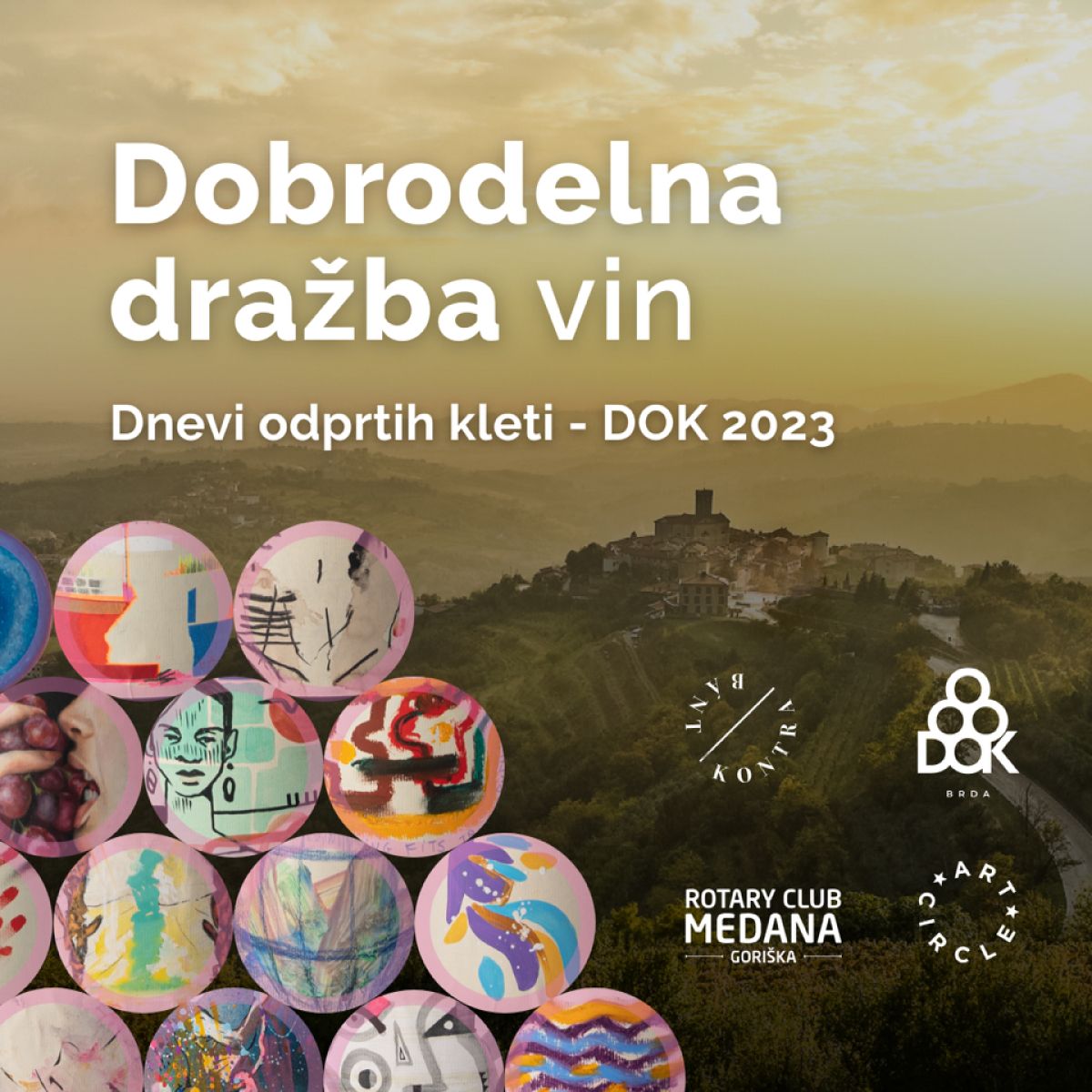 Letošnja dražba vin bo nekaj zelo posebnega, saj so moči združili 36 briških vinarjev, ki sodeluje na dogodku Dnevi odprtih kleti – DOK 2023, ekipa rotarijcev, organizator dogodka Kontrabant in Mednarodni Festival Vizualnih Umetnosti ART CIRCLE International. Po dobrem mesecu dela je tako nastalo 37 edinstvenih 3-litrskih steklenic, vsaka od njih opremljena z unikatno in neponovljivo etiketo mednarodnih umetnikov, ki so bili izbrani za umetniške rezidence na ART CIRCLE SPRING 2023 festivalu marca v Goriških brdih. Steklenice bodo zapakirane v posebnem lesenem zabojčku z logotipom. “S projektom smo želeli poudariti skupne vrednote vseh štirih partnerjev: dobrodelnost, vinarstvo ter vinogradništvo, umetnost in skrb za okolje,” pove organizator dogodka Dnevi odprtih kleti – DOK Brda Dani Strehar.