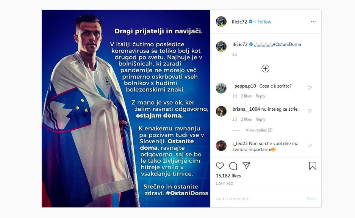 "V Italiji čutimo posledice koronavirusa še toliko bolj kot drugod po svetu. Najhuje je v bolnišnicah, ki zaradi pandemije ne zmorejo več primerno oskrbovati vseh bolnikov s hudimi bolezenskimi znaki. Z mano je vse ok, ker želim ravnati odgovorno, ostajam doma. K enakemu ravnanju pa pozivam tudi vse v Sloveniji," je zapisal Iličić na Instagramu.
