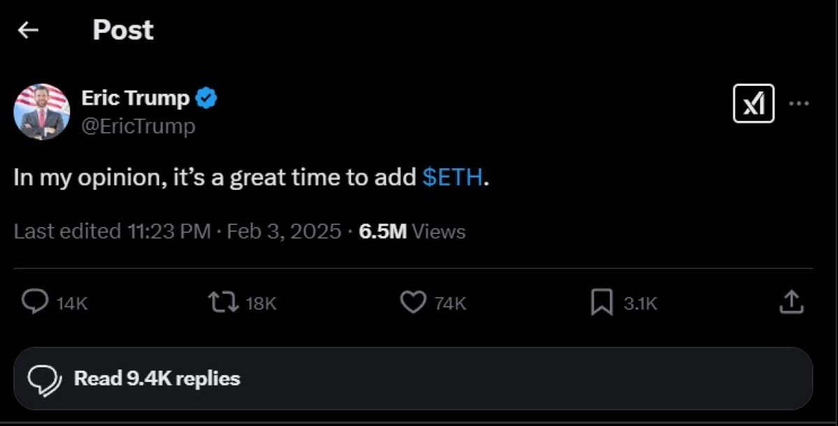 Tvit Erica Trumpa o Ethereumu je v kombinaciji s stališčem Donalda Trumpa, ki je naklonjen kriptovalutam, še dodatno podžgal tržne špekulacije.