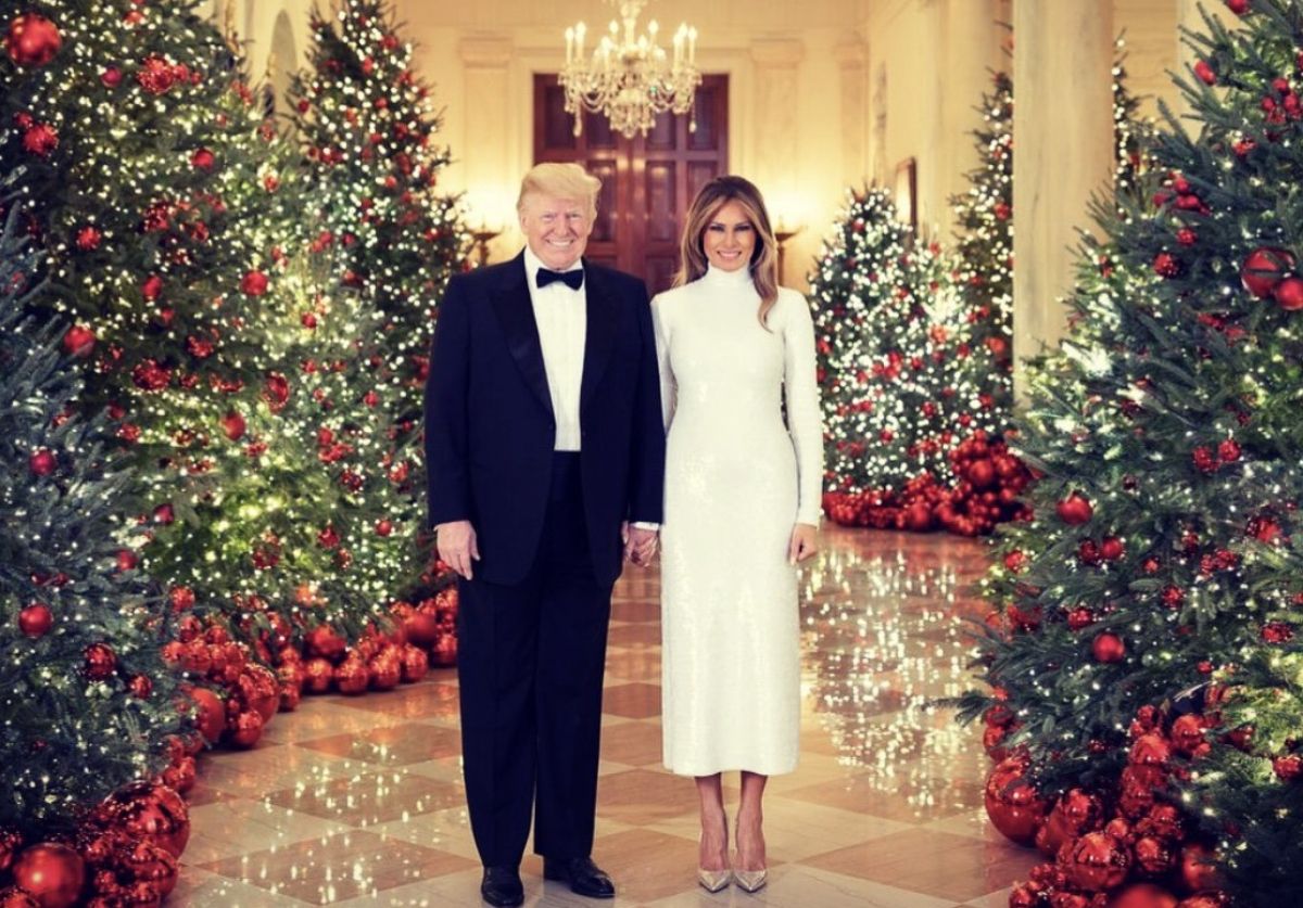 Melania in Donald na fotografiji pozirata v praznično okrašeni dvorani Bele hiše, katere božično krasitev je nadzorovala prva dama.