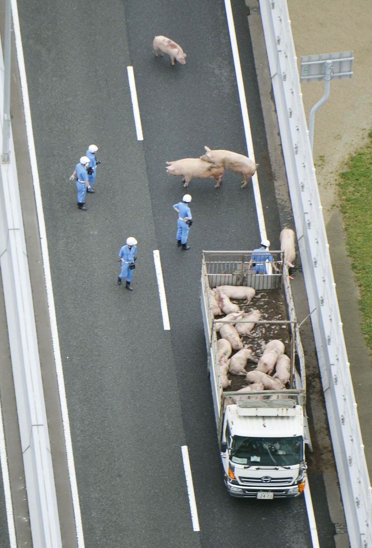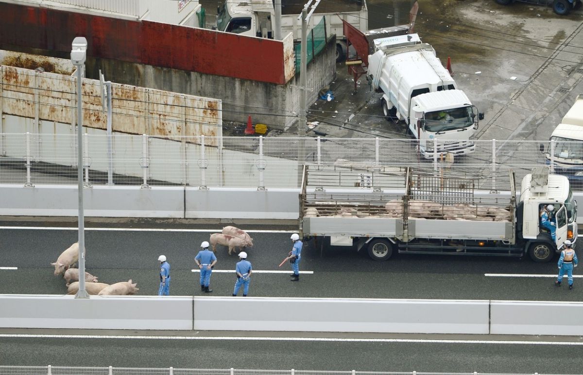 Devetnajst od 37 prašičev se je odločilo za drzen poskus bega. Policija v mestu Osaka je v njihovo iskanje vložila obilico truda in napora. Vse prašiče so namreč ujeli šele po petih urah, medtem pa je bil ustavljen celoten promet na avtocesti.