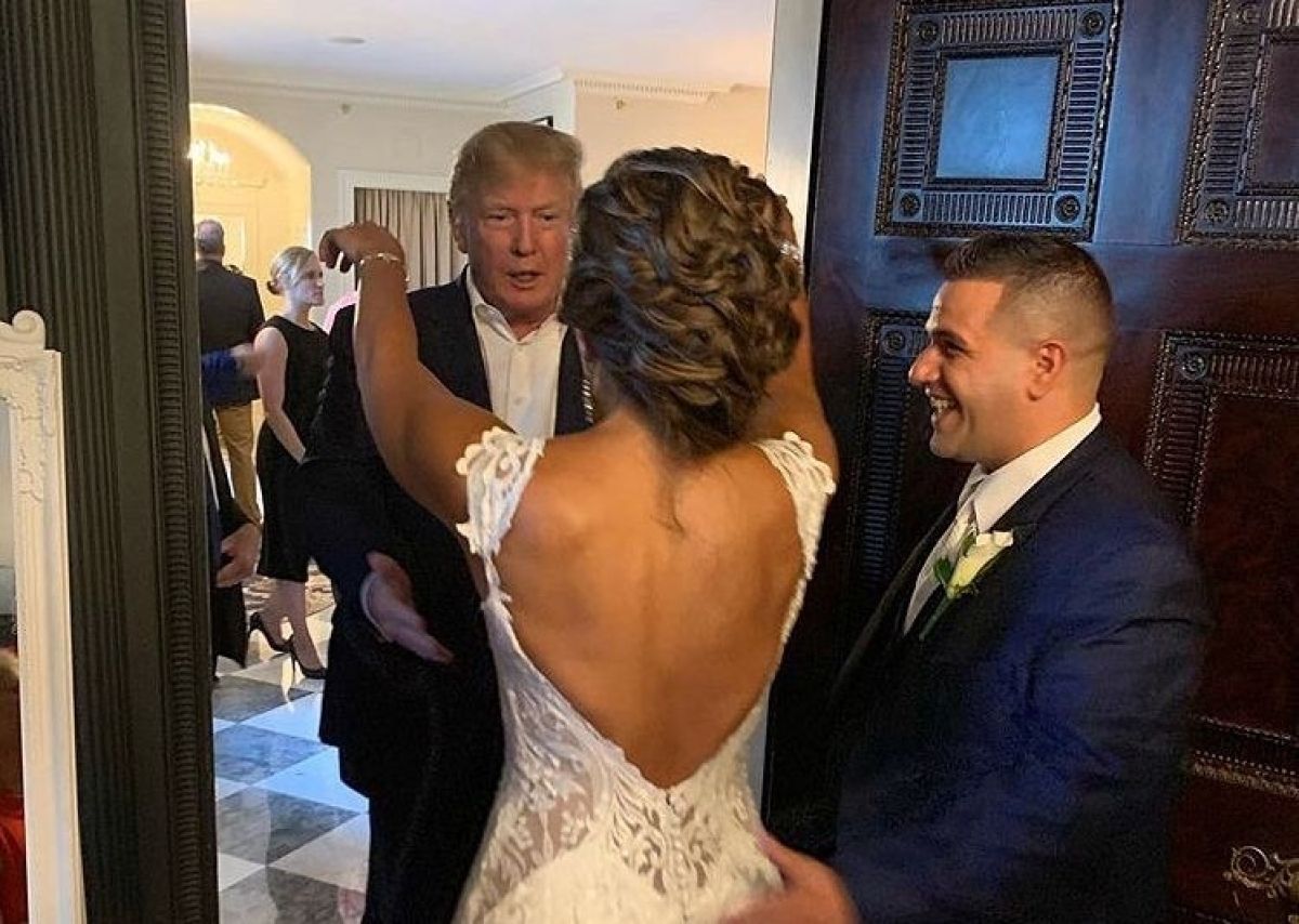 Ženin in nevesta sta upala, da bo Trump, ki je vikend preživel ob igranju golfa v svojem klubu, prišel na poroko in predsednik ju ni razočaral. Varnostniki so večino gostov sicer držali nazaj, a mladoporočenca sta smela objeti Trumpa. Melanie