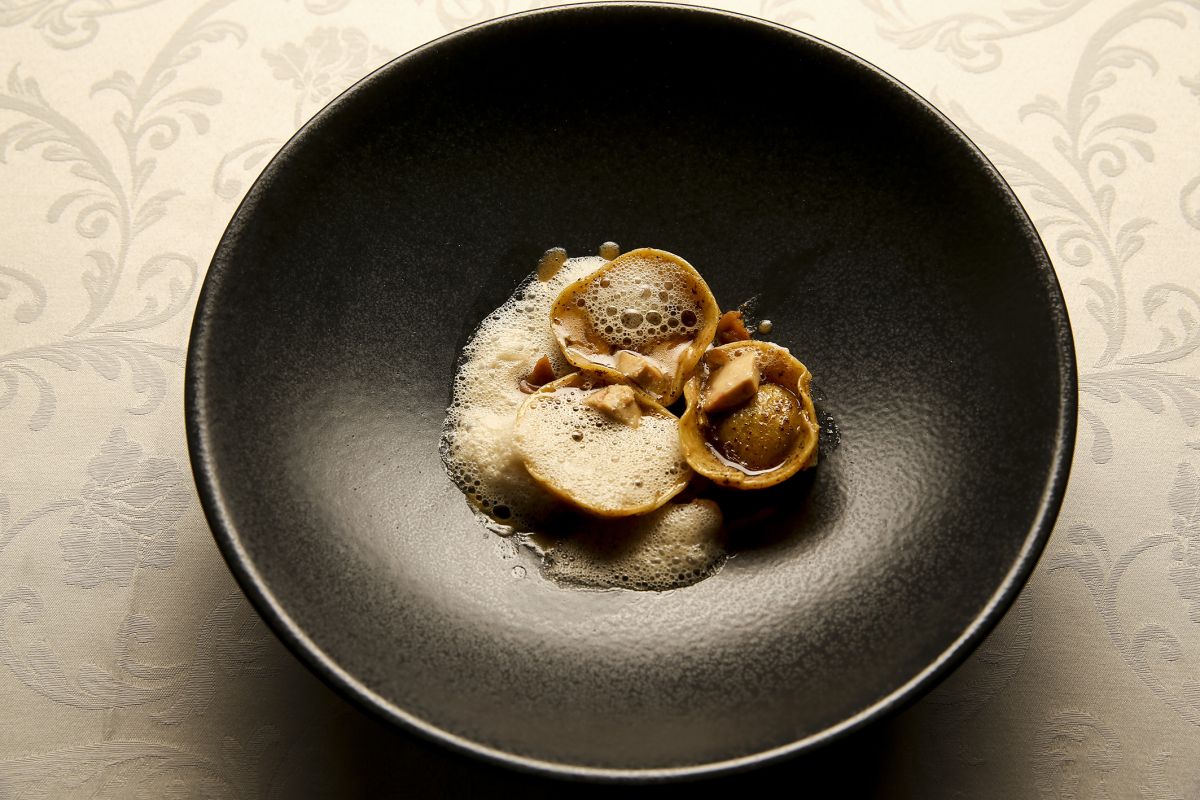 Ravioli s pistacijami in kozjo skuto, hruškovo kremo, gosjimi jetri ter telečjo in smetanovo omako