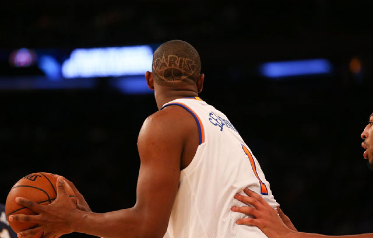 Košarkar s pričesko z besedo Paris in podobo Eiffelovega stolp