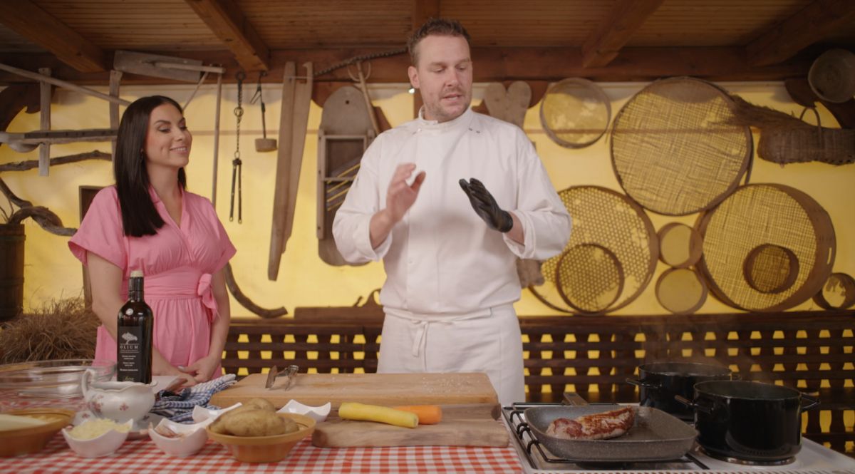 V peti oddaji Kralj svoje kuhinje, ki si jo lahko ogledate vsak ponedeljek ob 20.00 na Aktualu, se je Ajda Mlakar odpravila v njeno rodno Zasavje, v Podkum, v gostilno Pr Čop, kjer kraljuje kuharski mojster Lojze Čop. Za kuharski izziv mu je prinesla svinjsko ribico, grah, korenje, mlad krompir in bel balzamični kis. Lojze je povedal, da ima svinjino rad, ker je lokalna, okusna in dobra. Pri svinjski ribici je treba paziti, da se ne prepeče, ker je potem pusta. Mlad krompir sta z Ajdo nadevala s slanino in sirom in ga gratinirala v pečici.