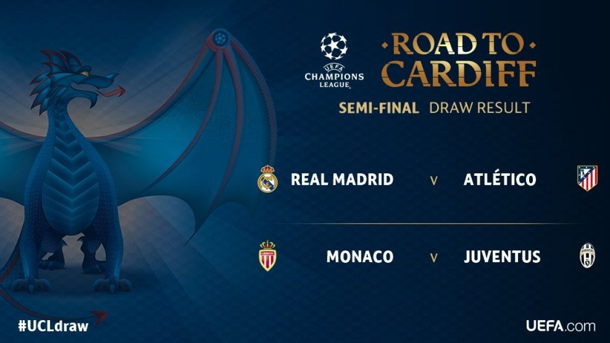 Prva tekma madridskega derbija bo na stadionu Santiago Bernabeu, povratna pa na domovanju Atletica Calderonu. V drugem polfinalnem paru bo prvo tekmo gostil Monako, povratna pa bo v Torinu.
