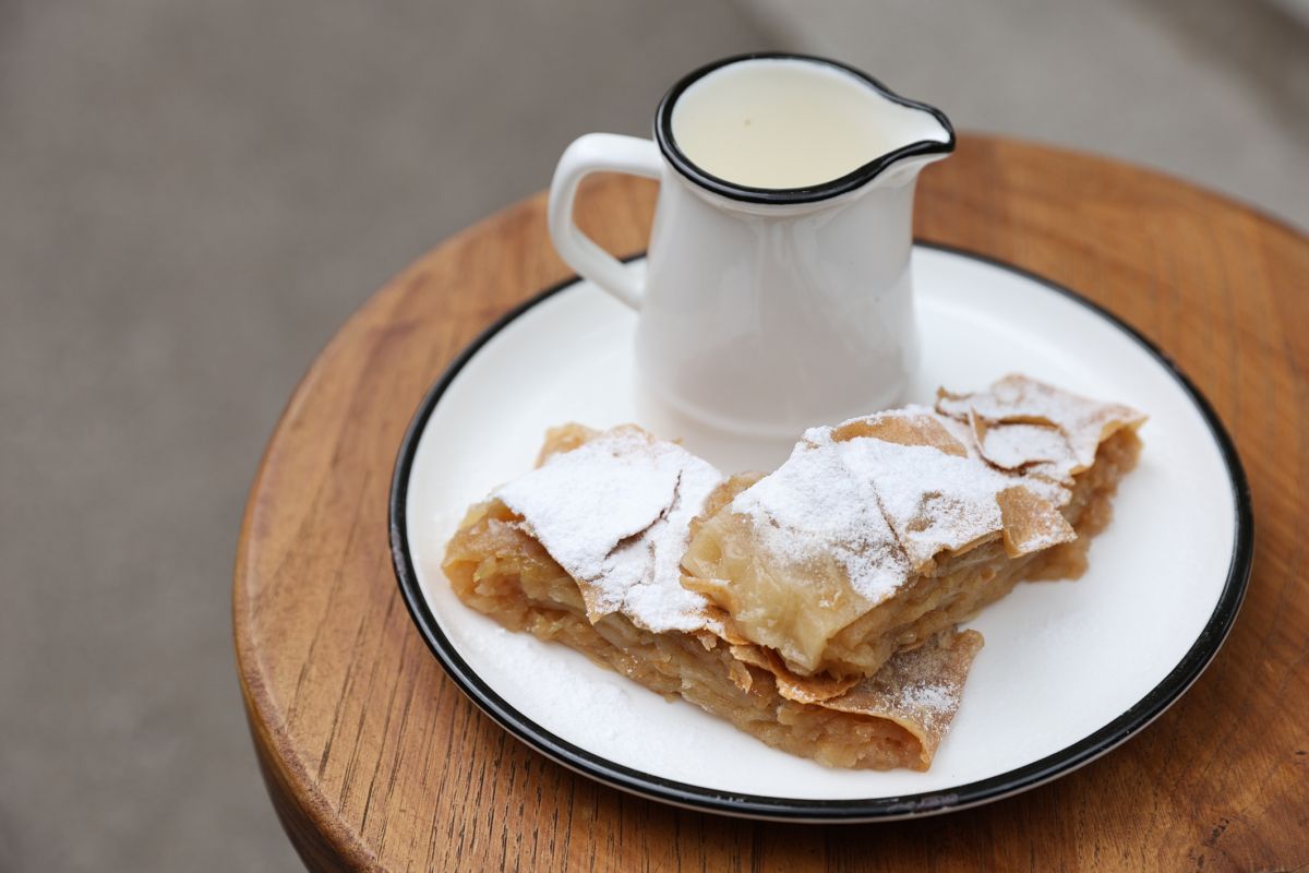 Ker smo veliki ljubitelji štrudlja, smo za epilog naročili še jabolčnega, ki se po domači navadi postreže s kislo smetano, originalno, v germanskih deželah, od koder jabolčni štrudelj izhaja – peči so ga začeli že v 18. stoletju v Avstro-Ogrski – pa se postreže s stepeno vaniljevo kremo.