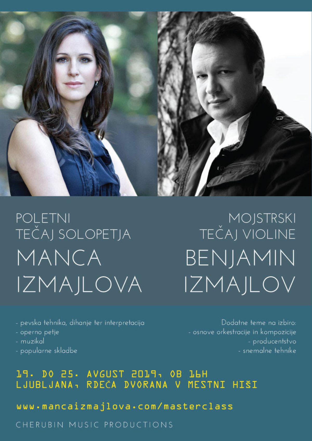 Velja poskusiti. V Rdeči dvorani Mestne hiše v Ljubljani se lahko med 19. in 25. avgustom udeležite tečaja solopetja in mojstrskega tečaja violine, ki ju organizirata mezzosopranistka Manca Izmajlova ter njen mož in violinist Benjamin Izmajlov.