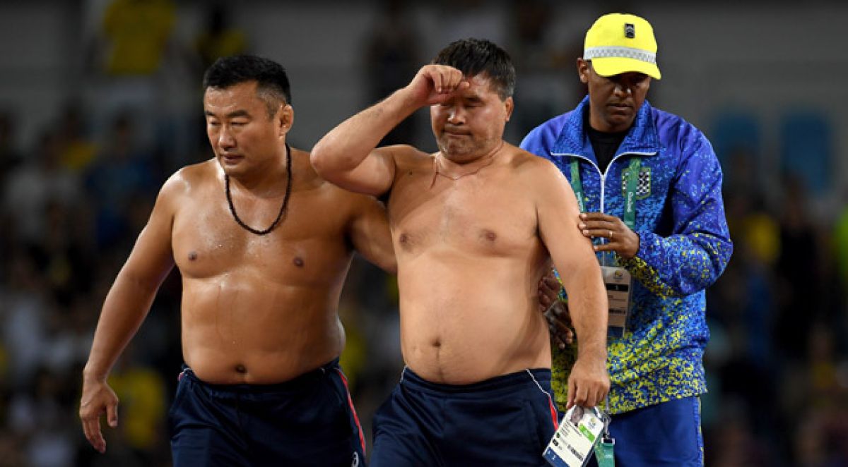 Iz protesta zaradi izgube bronaste olimpijske medalje, ki je veljala tako rekoč za gotovo, sta se mongolska trenerja ob zaključku rokoborskih bojev na olimpijskih igrah v Riu slekla, eden od njiju do spodnjih hlač.