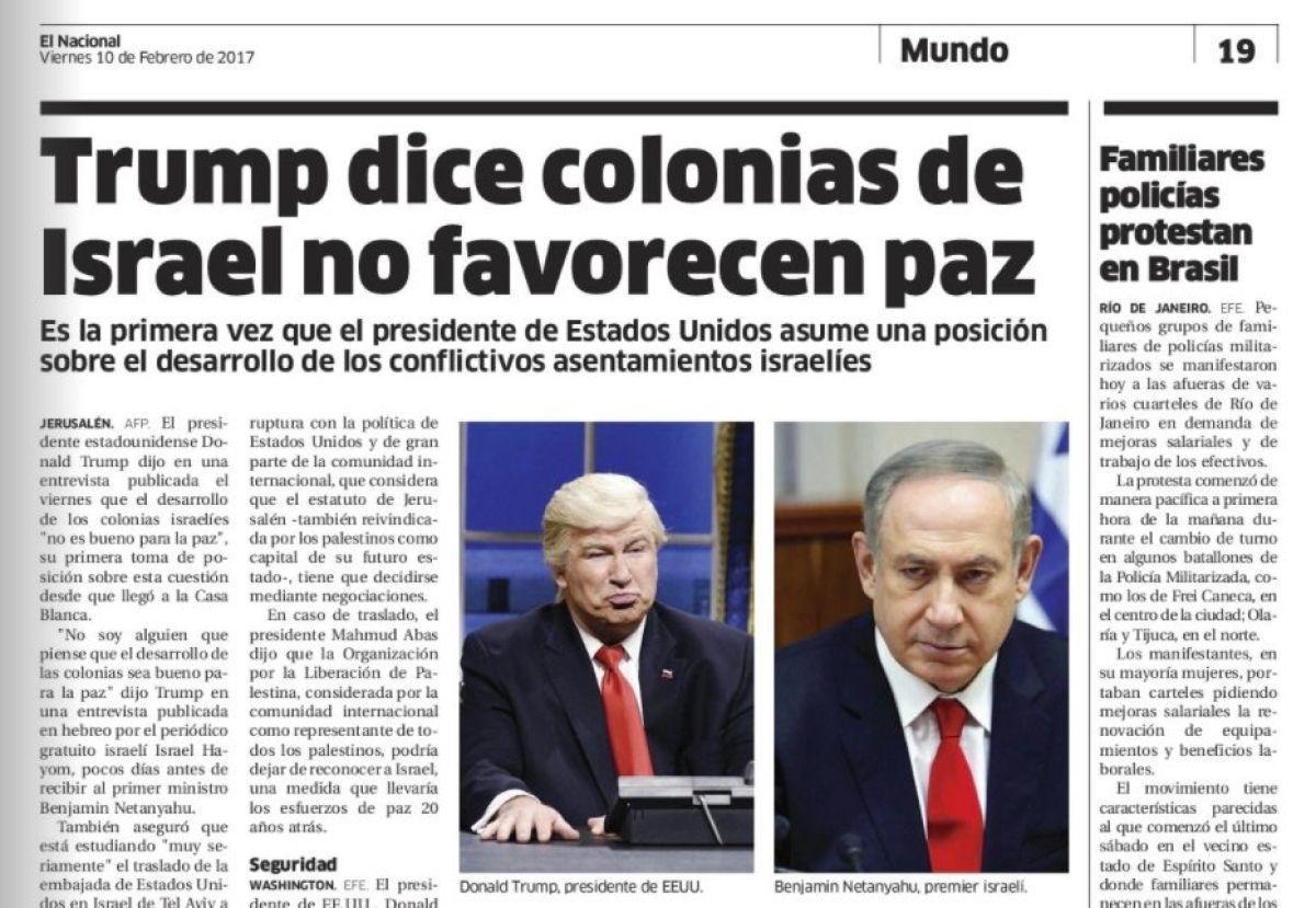 Na fotografiji, ki je očitno vzeta iz ameriške komične oddaje Saturday Night Live, je Baldwin preoblečen v Trumpa. Objavljena je bila v petkovi izdaji časnika El Nacional poleg fotografije izraelskega premierja Benjamina Netanjahuja.