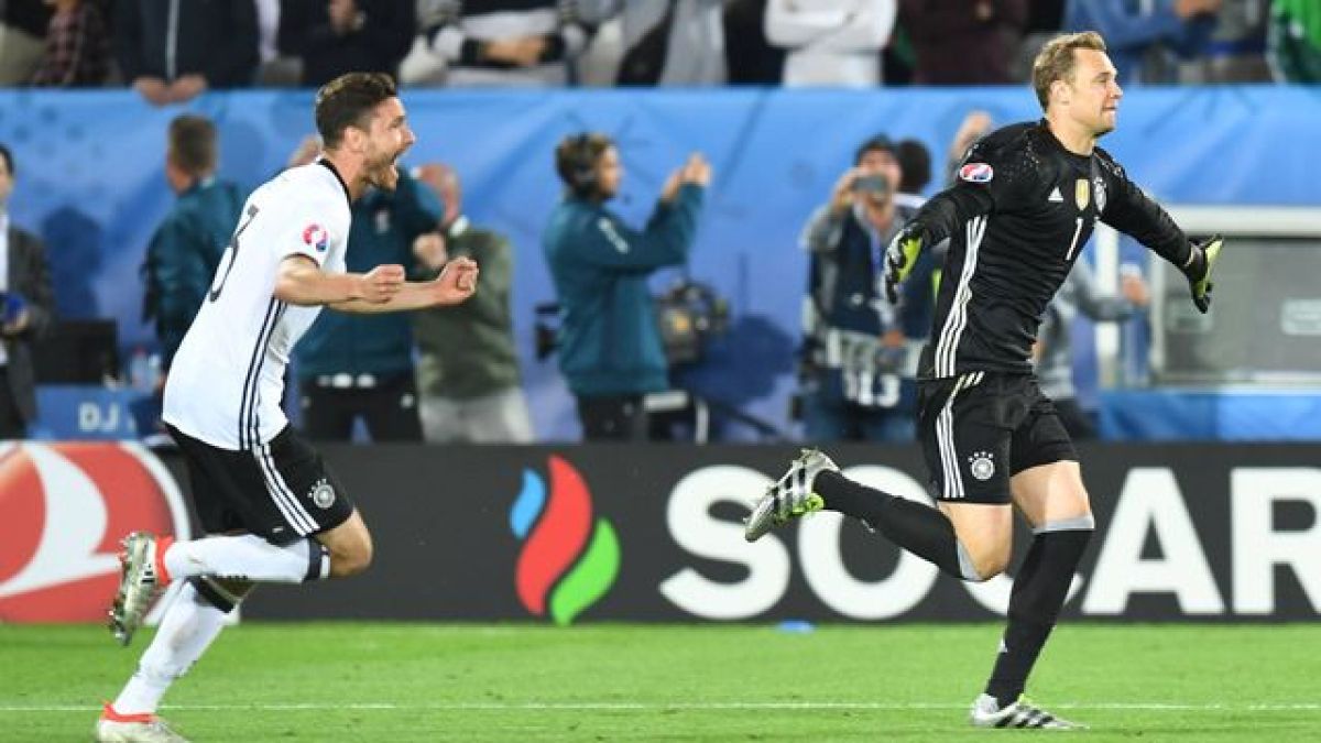 Nogometaši Nemčije so tretji polfinalisti evropskega prvenstva v Franciji. V četrtfinalu so po izvajanju enajstmetrovk premagali Italijo s 6:5. V četrtek 7. julija ob 21. uri se bodo pomerili z zmagovalcem dvoboja med Francijo in Islandijo, v prvem polfinalu 6. junija pa bosta igrala Portugalska in Wales.