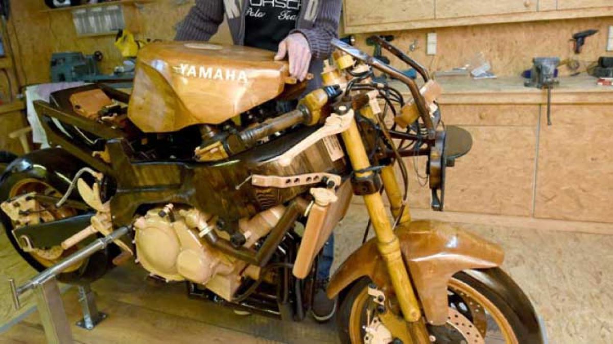 Njegova replika yamahe FZS 600R Aral Cup v naravni velikost je sedaj končno končana, 100-odstotno ročno izklesana iz lesa.