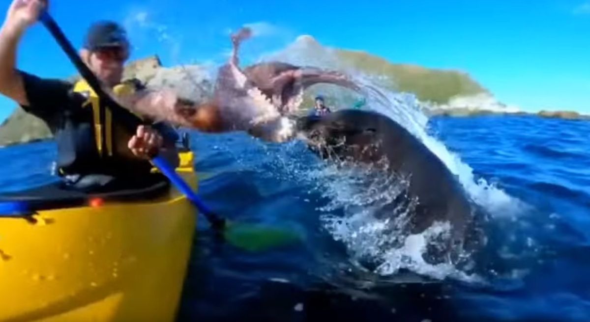 Neverjetno: tjulenj je skočil iz vodo in kajakašu prisolil klofuto s hobotnico (VIDEO)