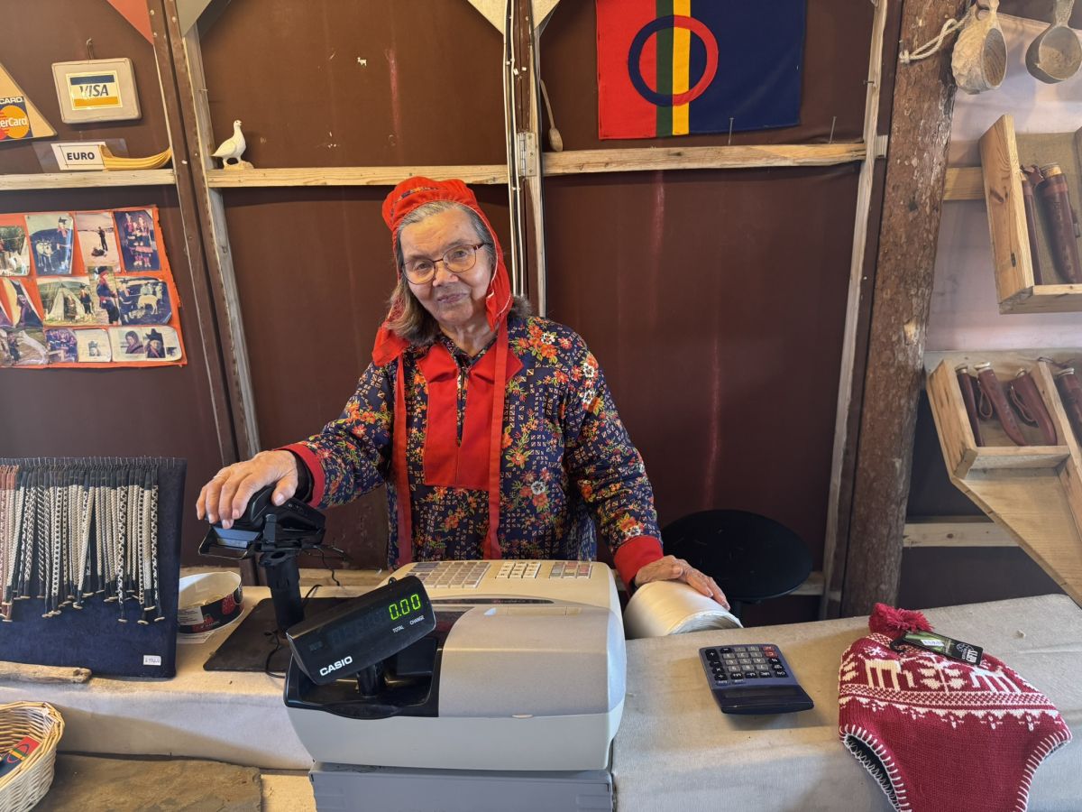Tik pod vrhom delavci na novo asfaltirajo cesto, zato malo daljši postanek v kolibi, ki služi za prodajanje spominkov. Starejša ženska ljudstva Sami je za blagajno opremljena s kartičnim terminalom, zunaj streljaj stran pa je postavljen tradicionalni šotor in za ograjo privezan ostarel severni jelen.