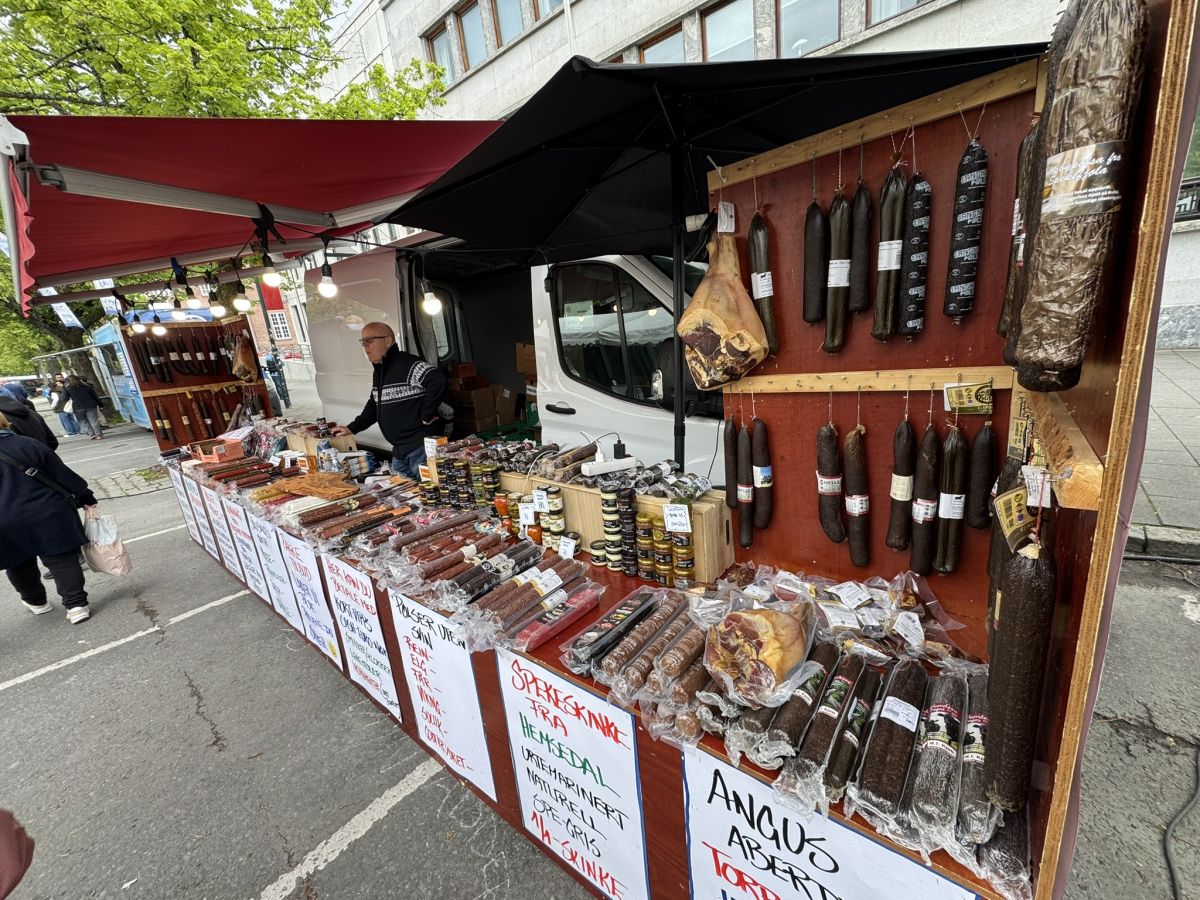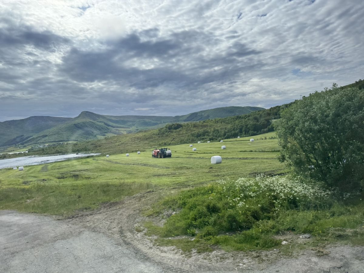 Spet so se odprli pogledi na travnike, ki so bili tudi na severu posejani z belimi balami sveže pokošenega travinja. Kmetijstvo je na Norveškem še vedno pomembna gospodarska panoga; tako živinoreja kot poljedelstvo. Vlada v Oslu je domače kmete, ki imajo težke razmere za pridelavo hrane, zaščitila z visokimi uvoznimi carinami pred poplavo poceni sadja in zelenjave iz južnih držav EU, denimo Španije. To velja tudi za vse vrste mesa in mlečne izdelke. V trgovskih verigah, najbolj razširjenih diskontih Rema 1000, Kiwi in Coop Extra, od juga do severa države prevladujejo domači proizvodi in njihove blagovne znamke. Visoki stroški distribucije trgovskega blaga na odročna območja (trgovske verige oskrbujejo svoje poslovalnice na severu tudi z dostavo kontejnerjev na tovornih vlakih in ladjah) še dodatno dvigujejo že tako visoke cene hrane na Norveškem.