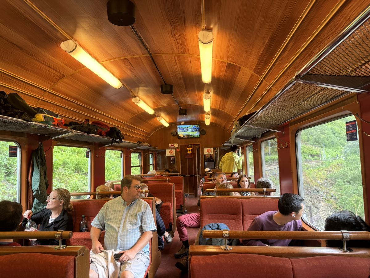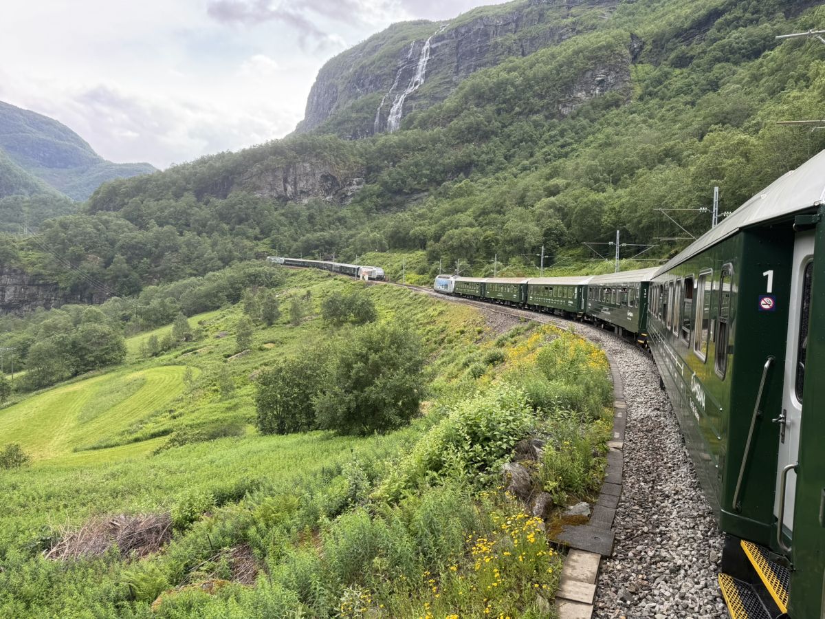 Na koncu stranskega rokava Sognefjorda – Aurlandsfjorda je vasica Flam. Norledov katamaran, ki je »parkiral« poleg mogočne križarke, je bil videti prav majcen. Po izkrcanju je spet pričelo deževati, večina potnikov je bila namenjena naprej, prava pustolovščina se je šele pričela. Streljaj od pristanišča je namreč spodnja postaja svetovno znane flamske železnice (Flamsbana), ki velja za eno najbolj spektakularnih železniških poti, a do odhoda nas je ločila še dobra ura. Vožnja v starih vagonih, ki jih danes navkreber vleče električna lokomotiva, traja slabo uro.