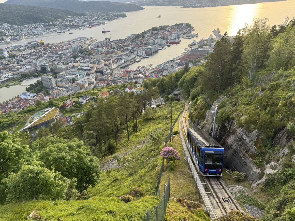 Tudi vožnja z bergenskega letališča v center mesta je slikovita, saj je mesto s skoraj 300 tisoč prebivalci zrinjeno med morjem, gorami in fjordi na zahodni, atlantski obali Norveške. V Bergnu zato zelo pogosto dežuje, na leto v povprečju beležijo kar 230 deževnih dni. Zaradi spremljajočega vetra dežnik pogosto ni dovolj, turistom svetujejo še nepremočljivo jakno in vodoodporno obutev. A tisto sobotno popoldne v drugi polovici junija, ko sem se znašel tam, je močno sijalo sonce. Pa tudi vlak z letališča z nekaj vmesnimi postajami je pripeljal prav v strogi center mesta, nekaj sto metrov stran od hotela, kjer sem imel za dve noči rezervirano sobo.
