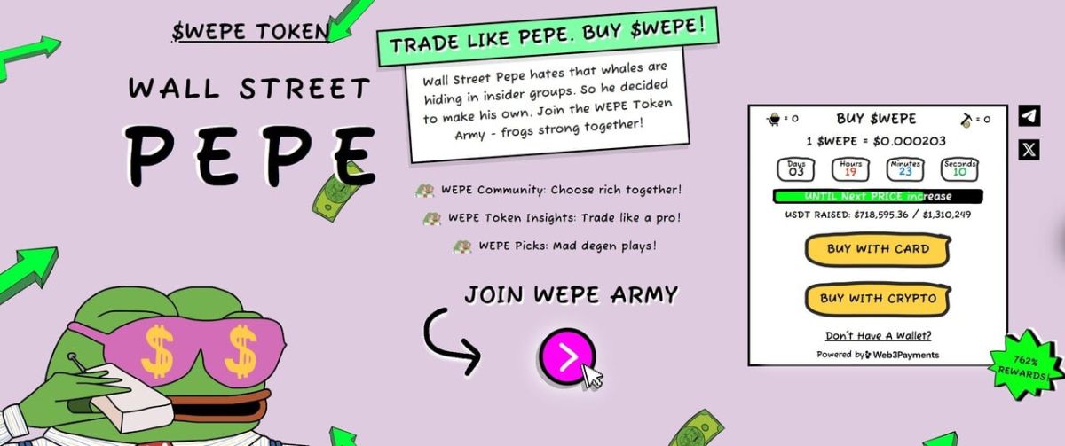 Največji uspešneži načrta? Ekskluzivni signali za trgovanje prek platforme Wepe Army, prihajajoči tečaji DEX in nagrade za staking in sicer več kot 1.300 % letnega donosa (APY).Skupaj je bilo vloženih že več kot 530 milijonov dolarjev. Če vam je ta žeton padel v oči, je zdaj pravi trenutek, da naredite korak. Nekateri kriptoanalitiki že namigujejo, da bi to lahko bil naslednji „moonshot“ v slogu Pepe.
