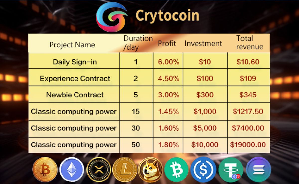 (Različne pogodbe imajo različne stopnje računske moči, zneske naložb in pogoje. Za več informacij obiščite uradno spletno stran CrytocoinMiner.)