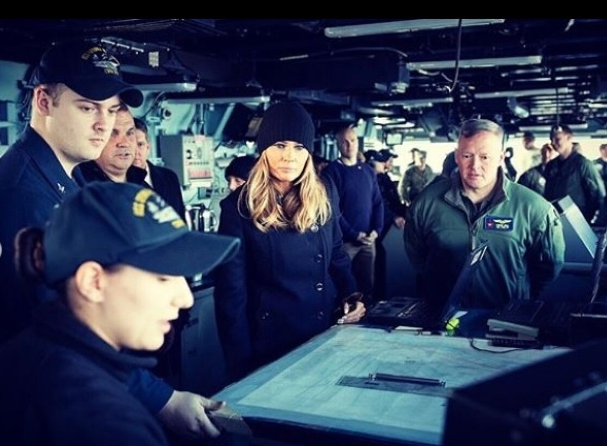 Med pristankom na letalonosilki USS George HW Bush (imenovani po nedavno preminulemu 41. ameriškemu predsedniku) v sredo, 12. decembra 2018, ko se je pridružila posadki, jo je spremljala televizijska ekipa Fox News. Posnetki so bili predstavljeni med intervjujem, ki ga je imel s prvo damo znani voditelj Sean Hannity.