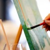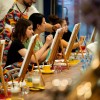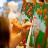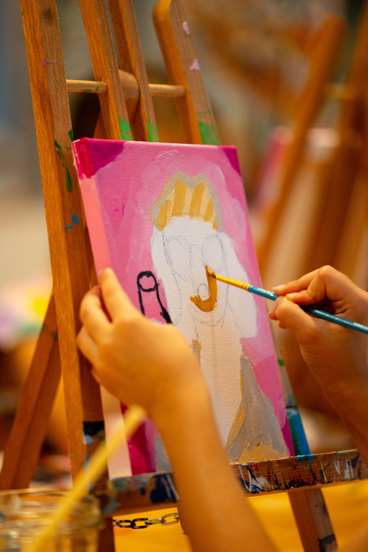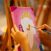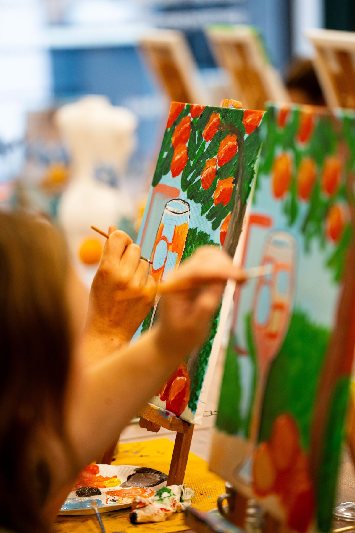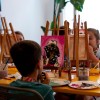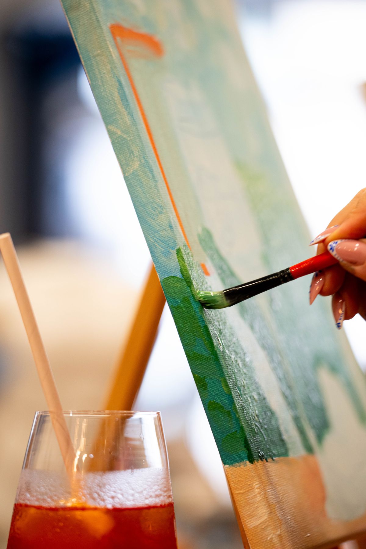 Na kreativni delavnici udeleženci ustvarjajo slike na platnu, medtem ko uživajo v kozarcu vina ali drugih pijačah.
