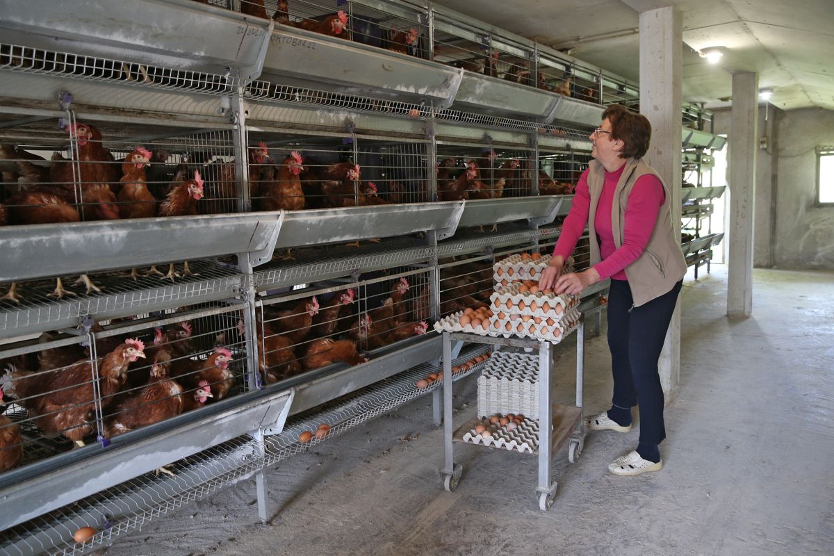 Pri nas so različne vrste reje kokoši. Na tej kmetiji so se odločili za rejo v obogatenih kletkah, torej imajo kokoši več prostora kot pred leti. Kar pomeni tudi manj kokoši v eni kletki. »Klet je opremljena z brskališčem, gredicami, skritim kotičkom, kjer kokoši znesejo jajca, tla pa so v naklonu, da se jajce, ko ga kokoš znese, lepo počasi odkotali in ne pride v stik s kurjeki.«
