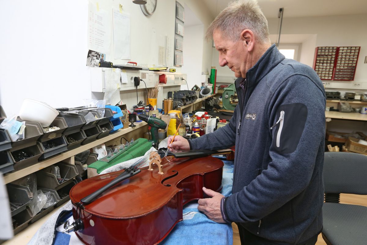 Nastavitev duše zahteva več spretnost hkrati, pove serviser Borut. Slišim prav, je rekel duša? »Mirno roko mojstra, občutek za pravo mesto postavitve in ravno pravšnjo napetost strun, ki jo drži pri miru. Potem pridejo na vrsto druga popravila, kot na primer zapolnitev razpok na violončelu in »sfriziranje« okrušene barve na glasbilu z ujemajočim barvnim odtenkom,« nadaljuje in vzame v roke dve orodji, eno identično ogledalcu, ki ga uporabljajo pri delu zobozdravniki, in drugo umetelno zavito, prav tako kovinsko, nekakšno dleto z držalom iz posebnega materiala za finejši oprijem.