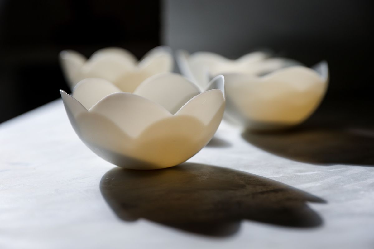 Mavec je porozen in srka vase vodo iz mase. Porcelan se tako že v kalupu skrči, kar omogoči, da ga lahko odstranimo iz kalupa, po žganju v peči na 1300 stopinjah pa se skrči še za približno 20 odstotkov. Dalj časa kot je mavec v kalupu, debelejše so njegove stene, a načeloma, vsaj glede izdelkov, ki jih izdelujeta Nika in Boštjan, gre za tanke stene porcelana, skozi katere prodre tudi svetloba, prosojnost pa daje še dodaten čar pastelnim glazuram.