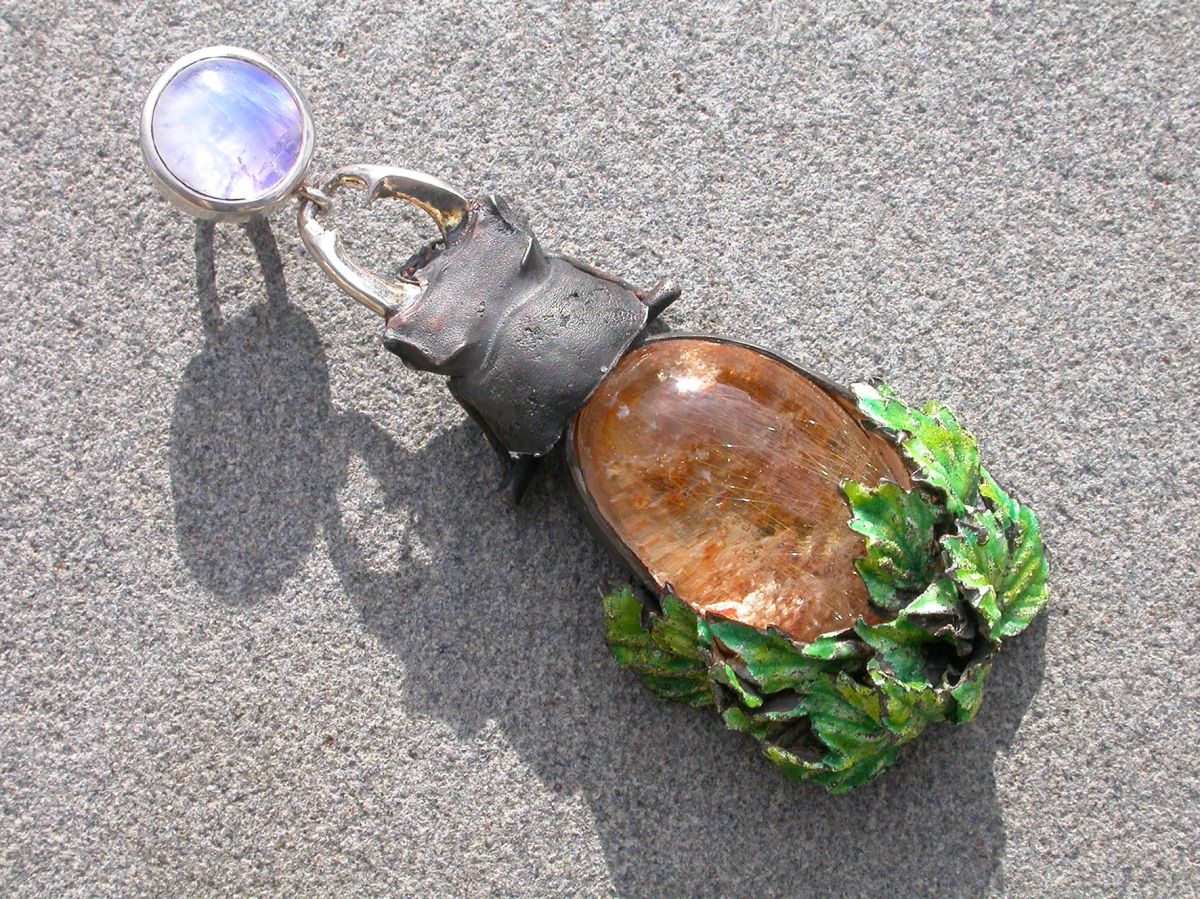 Mojster nosi konkreten usnjen visoki predpasnik za zaščito, pove in pokaže gorilnik, ki ga vklopi z dotikom stegen. Tudi miza ima predpasnik, pripomnim. »Vsak najmanjši delec, ki ga uporabljam, ima vrednost, mnogo je tudi kamnov, ki hitro lahko spolzijo med prsti, zato je zaščita nujna. Poglejte, kaj vse se je na njem že nabralo,« pokaže z roko. Res zajeten raznoliko svetlikajoč se kupček se zasveti. Nad njim pa ob mizo pritrjeno orodje. Različne pincete, pile, svedri, barve, topila, veliko vsega, a vse lično zloženo po vrstnem redu. Mojster sam nosi dolgo konkretnejšo verižico, a je pod predpasnikom obesek skrit. Zanima me, kakšen kos nakita izbere mojstra. »Moja igrača, kjer se vse vrti v svojo smer,« izvleče obesek na plano. Res je nekaj posebnega
