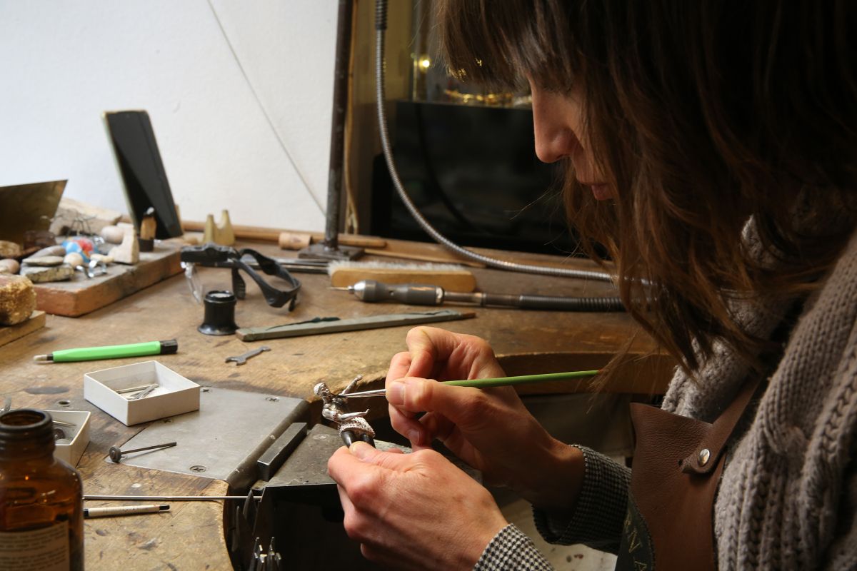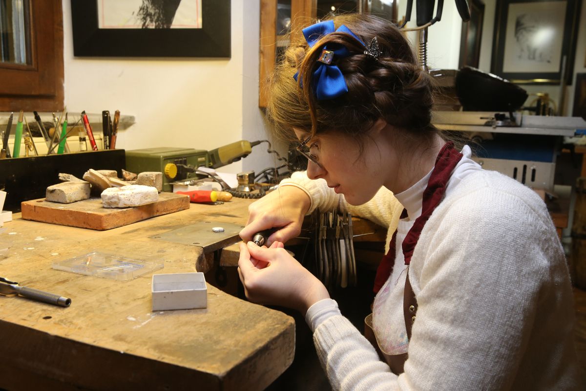Njegova dela so tako posebna, da zaustavijo prav vsako oko. Ko pozvonim na notranjih vratih, se stranka ravno odpravlja, pridni vajenki pa brez premora brusita, pilita detajle, na katere je Christoph še posebej pozoren. Znanje obrti namreč z veseljem prenaša na mlajše generacije. Vidim veliko srebrnih figuric, Nina Kamien Šimnovec ravno eni temni noge.