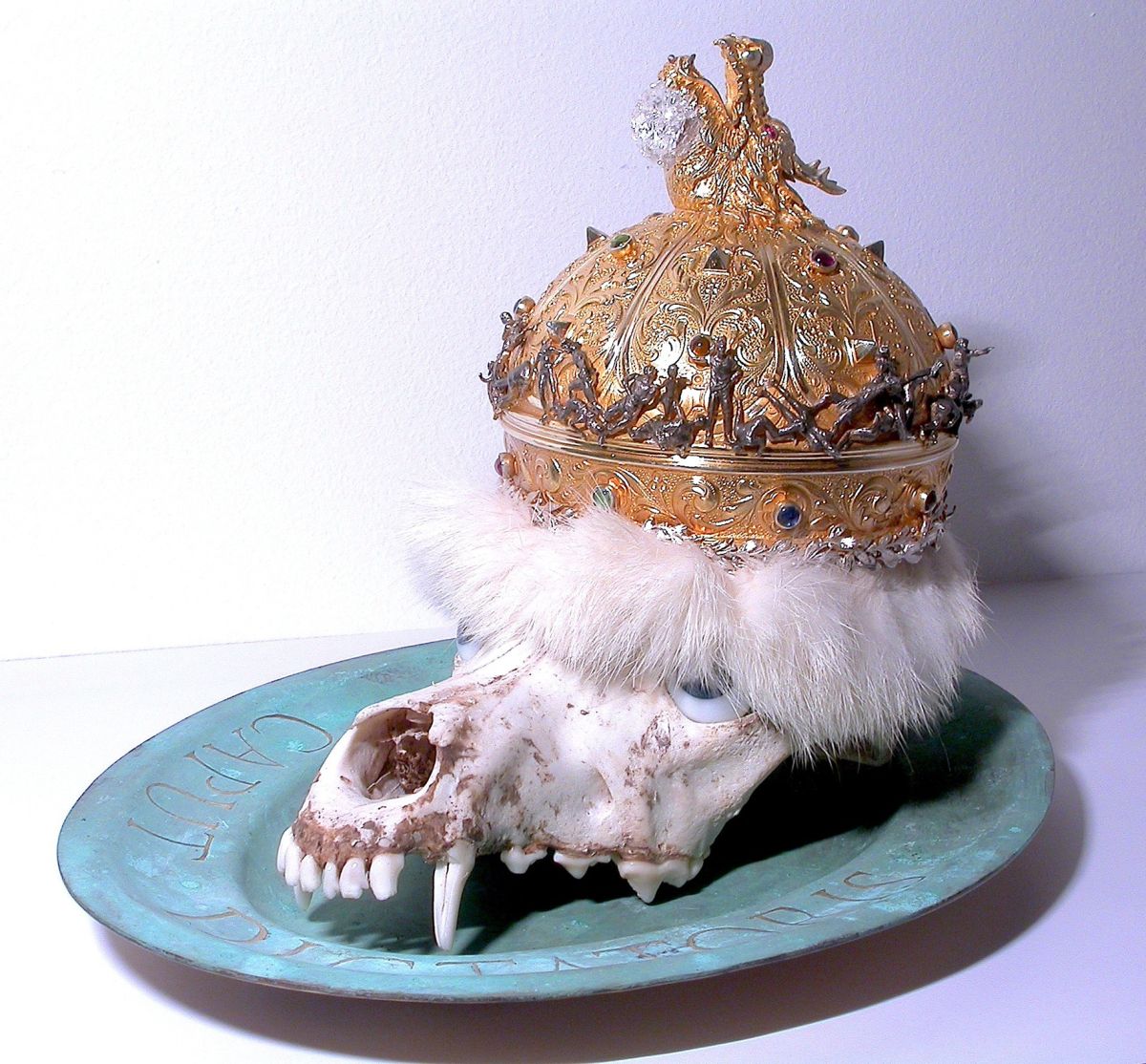 In potem zagledam nekaj, kar še posebej pritegne moj pogled, in sicer so me ustavili prav detajli figuric okoli mogočne zlate krone na glavi nekega okostja. Potem preberem: Konec dobe diktatorja. Figurice, ki so me pritegnile, predstavljajo narod, ki se upira in kliče po spremembi, začne razlago Christoph. Ne samo da je skulptura družbeno vpeta v dogajanje časa med svojim nastankom, izdelana je tudi iz raznolikih materialov.