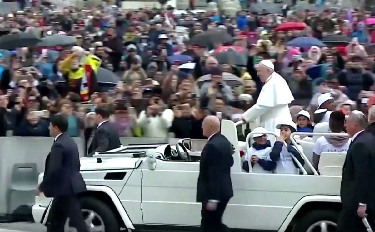 Otroci so se s Frančiškom in njegovim vozilom po osrednjem trgu v Vatikanu zapeljali pred papeževo splošno avdienco.