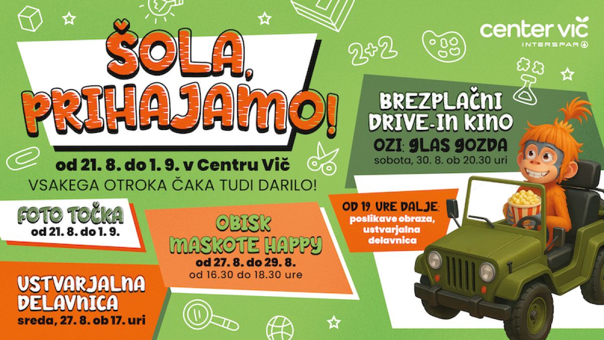 V Centru Vič bodo ob zaključku počitnic poskrbeli za sproščeno in zabavno dogajanje za otroke in starše. Vse do ponedeljka, 1. septembra, obiskovalce čakajo ustvarjalne delavnice, druženje z maskoto Happy, brezplačen ogled risanke v drive-in kinu ter številna druga presenečenja. Posebne ugodnosti in nagradna igra pa bodo poskrbele za še več razlogov za obisk.