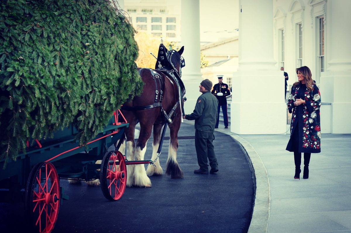 Nacionalno združenje za božično drevo vsako leto priredi natečaj, na katerem izberejo drevo, ki bo stalo v Beli hiši. Letošnji zmagovalec Larry Snyder ima farmo Mahantongo v kraju Pitman v Pensilvaniji. Melania Trump je drevo na konjski vpregi sprejela v spremstvu vojakov. Po pregledu, če je vse v redu, se je s Snyderjem fotografirala in vsem skupaj vnaprej zaželela vesel božič.
