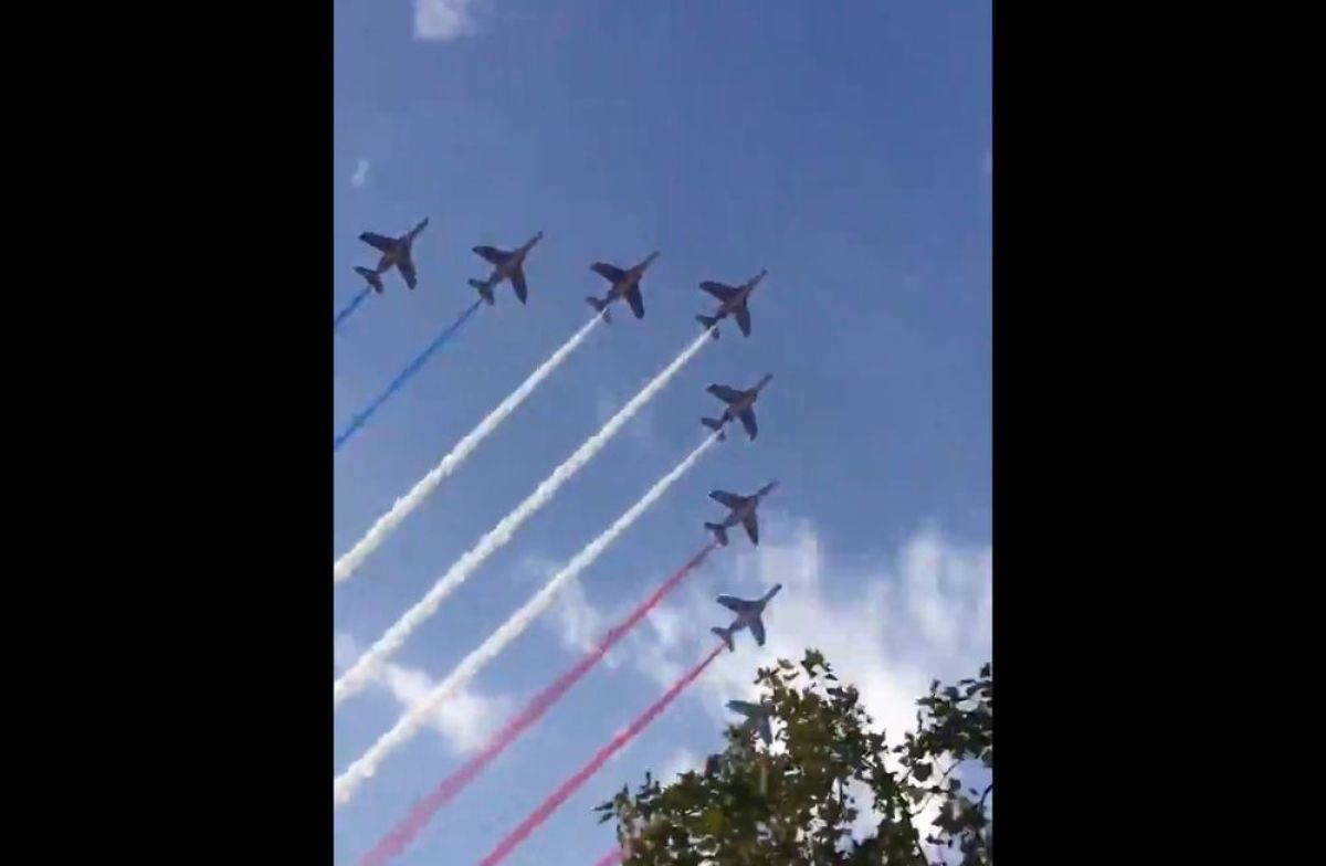 Nad njimi so poletela vojaška letala, ki so nebo obarvala v barve francoske zastave.