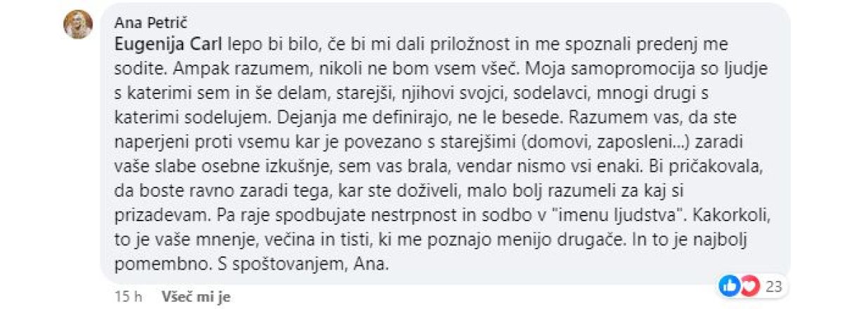 Direktno pa je odpisala Carlovi: »Eugenija Carl lepo bi bilo, če bi mi dali priložnost in me spoznali predenj me sodite. Ampak razumem, nikoli ne bom vsem všeč. Moja samopromocija so ljudje s katerimi sem in še delam, starejši, njihovi svojci, sodelavci, mnogi drugi s katerimi sodelujem. Dejanja me definirajo, ne le besede. Razumem vas, da ste naperjeni proti vsemu kar je povezano s starejšimi (domovi, zaposleni...) zaradi vaše slabe osebne izkušnje, sem vas brala, vendar nismo vsi enaki. Bi pričakovala, da boste ravno zaradi tega, kar ste doživeli, malo bolj razumeli za kaj si prizadevam. Pa raje spodbujate nestrpnost in sodbo v 'imenu ljudstva'. Kakorkoli, to je vaše mnenje, večina in tisti, ki me poznajo menijo drugače. In to je najbolj pomembno. S spoštovanjem, Ana.«