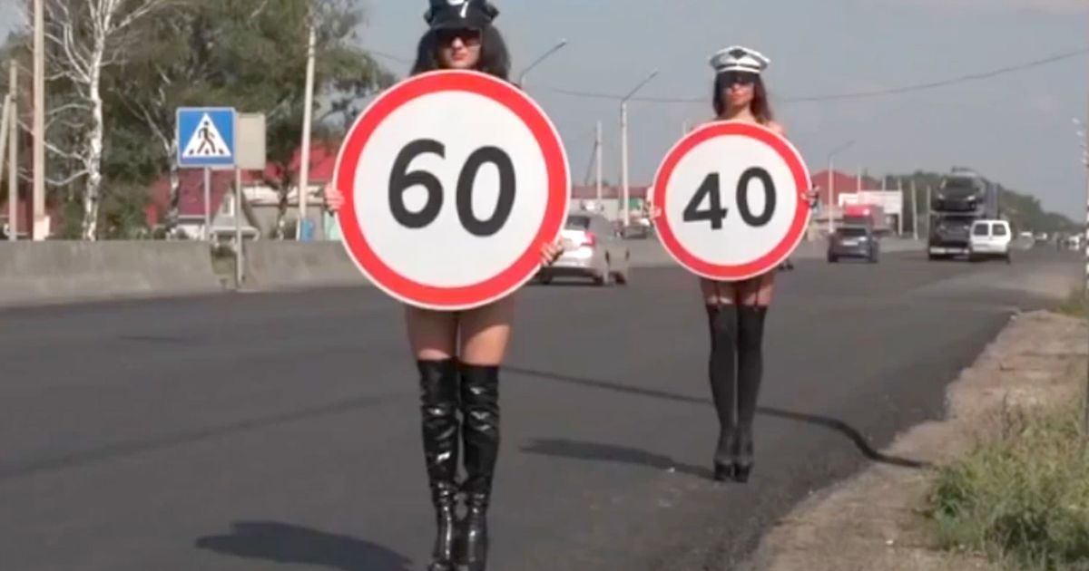 Prometni strokovnjaki Avtodrizhenie, ruske družbe za varnost v cestnem prometu, so po pritožbah domačinov v malem mestecu v bližini Nižnega Novgoroda, češ da vozniki divjajo skozi njihovo naselje, staknili glave in se odločili, da bodo prometne znake za omejitev hitrosti ob cesti nad glavami držala mlada dekleta „zgoraj brez“. Rezultat je bil presenetljiv. Zgodila se ni nobena prometna nesreča, vozniki so krepko upočasnili vožnjo, domačini so zadovoljni.