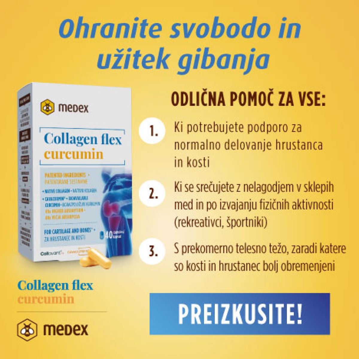 Zdravi sklepi so pomembni za posameznike vseh starosti, tudi za mlajše generacije. V Medexu so za tiste, ki veliko obremenjujejo kolena in druge sklepe, razvili visokokakovostni izdelek Collagen Flex Curcumin, ki je hitro postal najbolje prodajano* naravno prehransko dopolnilo za podporo hrustanca in kosti v slovenskih lekarnah. S svojo učinkovito kombinacijo sestavin je podpora hrustancu in kostem. Z njim lahko rekreativci, športniki ter vsi ostali s težavami s sklepi, ohranijo zdravje in gibljivost sklepov ter se veselijo aktivnega življenja.