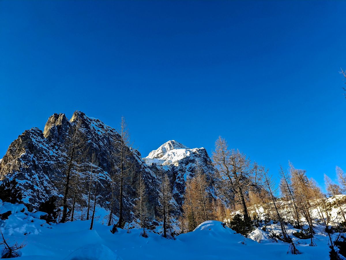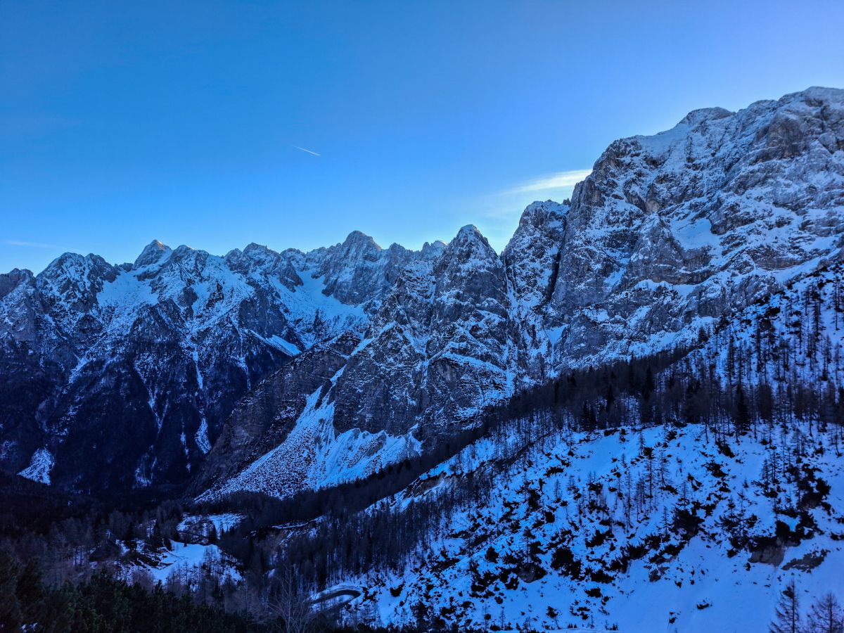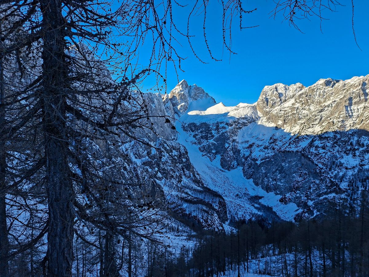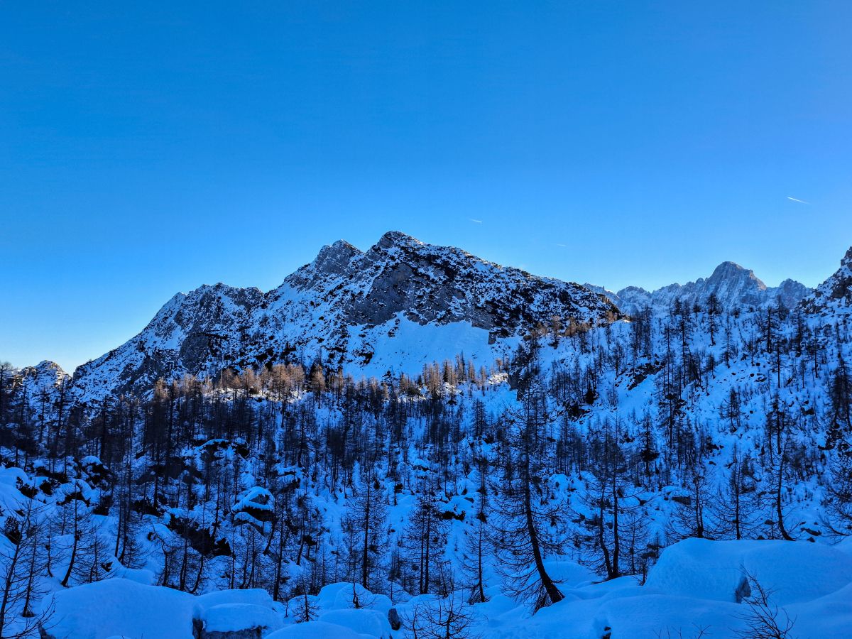 Na razpotju, kjer se poti iz Tamarja in Planice združijo z mojo, sem se za trenutek ustavil. Sedelce ponuja razgled, ki te vedno znova prevzame – Zadnja Mojstrovka stoji mogočno, Jalovec pa s svojo značilno podobo pritegne pogled in ga ne spusti več. Goli macesni so kot nemi stražarji varovali to alpsko kuliso, njihova silhueta pa je še dodatno poudarila zimsko resnost pokrajine.