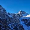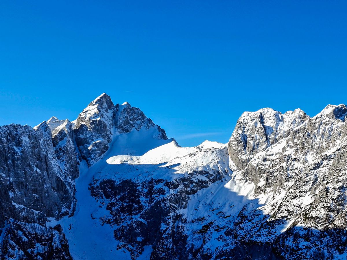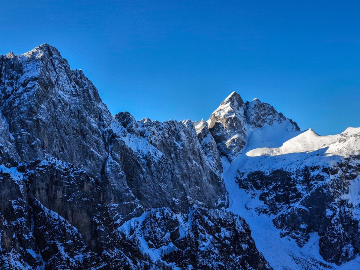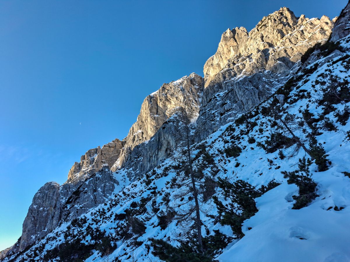 Na razpotju, kjer se poti iz Tamarja in Planice združijo z mojo, sem se za trenutek ustavil. Sedelce ponuja razgled, ki te vedno znova prevzame – Zadnja Mojstrovka stoji mogočno, Jalovec pa s svojo značilno podobo pritegne pogled in ga ne spusti več. Goli macesni so kot nemi stražarji varovali to alpsko kuliso, njihova silhueta pa je še dodatno poudarila zimsko resnost pokrajine.