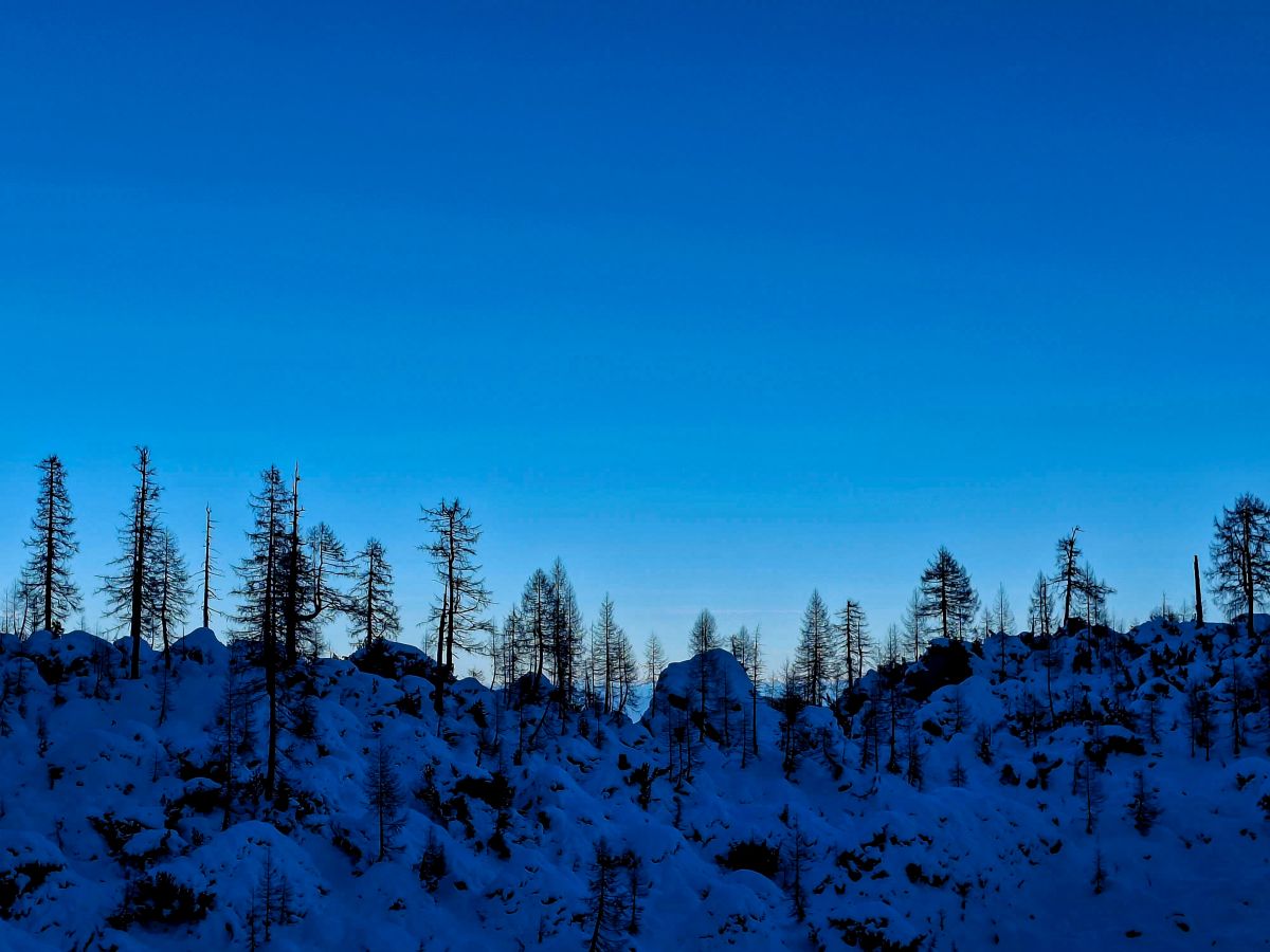 Tokrat sem dobro vedel, da so iglice že odpadle in da bodo njihova gola debla ustvarjala skoraj grafično, črno-belo kuliso za mogočen pogled proti Jalovcu. Slemenova špica se je zdela kot popolna izbira – dovolj dostopna, a vedno znova očarljiva.