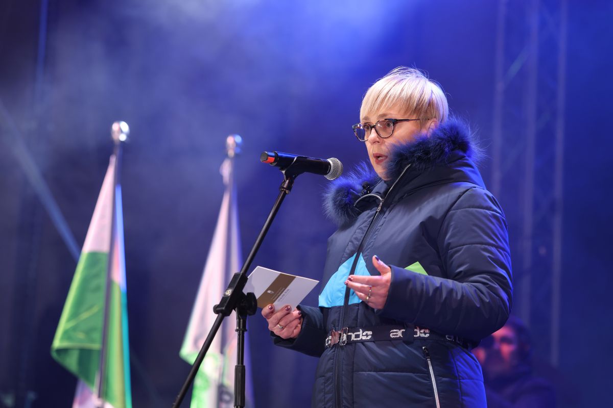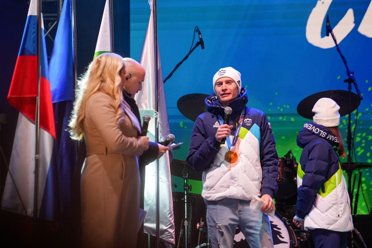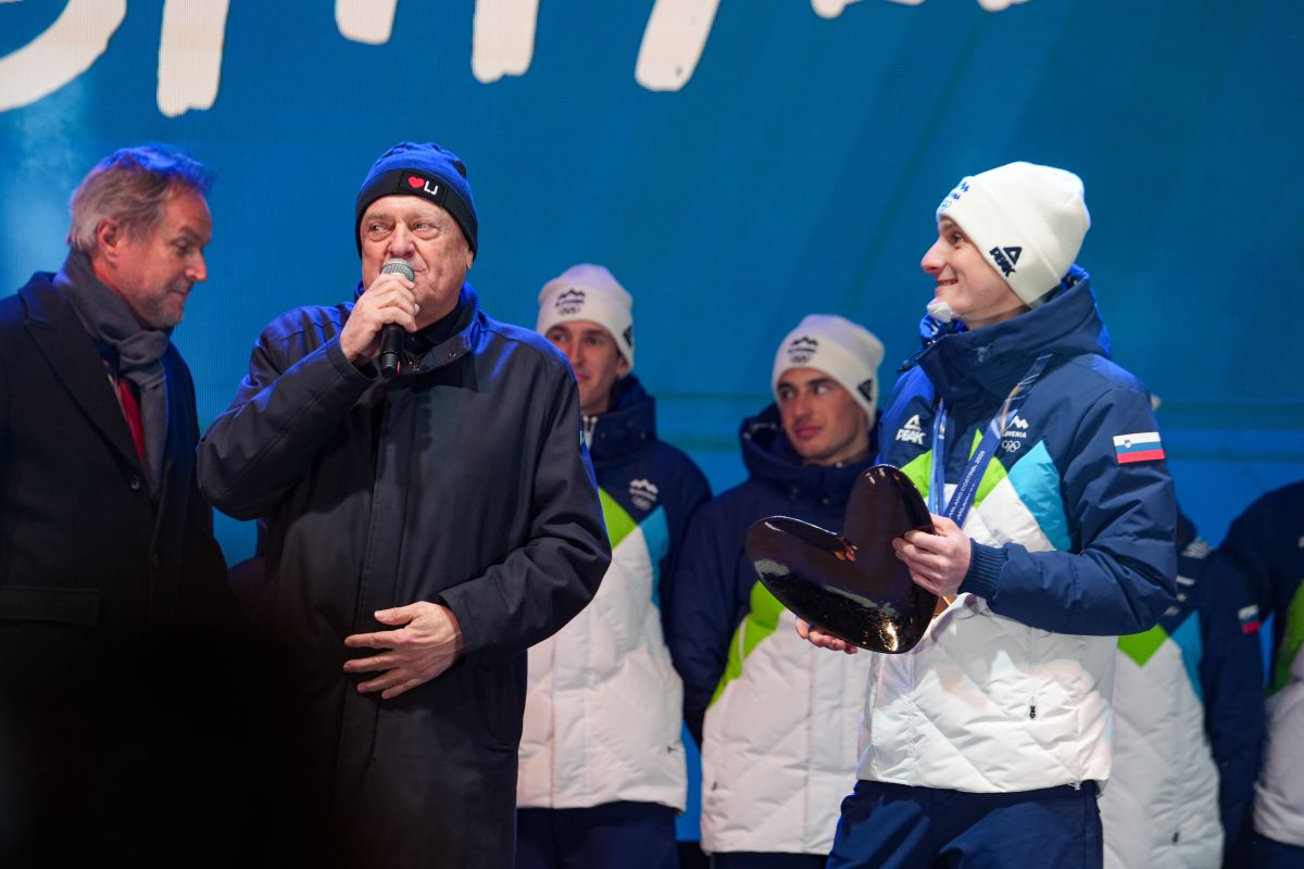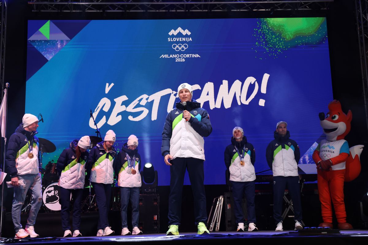 Navijači so sprejeli dobitnike olimpijskih medalj Domna in Niko Prevc ter Anžeta Laniška, zbrane pa je nagovorila tudi predsednica republike Nataša Pirc Musar.