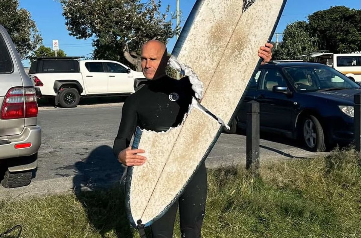 Fotografije, ki so zakrožile po družbenih omrežjih, prikazujejo deskarja na plaži z razpolovljeno desko, na kateri je velik ugriz morskega psa.
