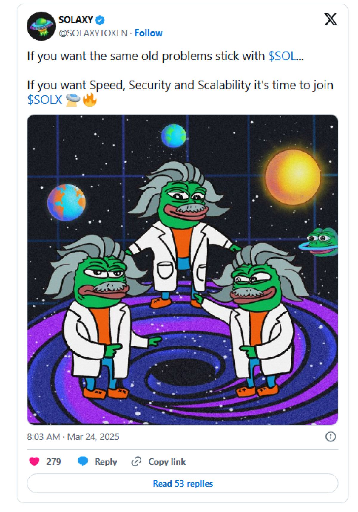 Solaxy in njeni zgodnji podporniki zagovarjajo vizijo izboljšane Solane - zato je Solaxy nedavno delil to objavo na portalu X: